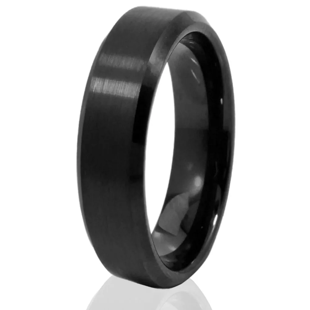 This black IP brushed tungsten wedding band features a brushed center and polished edges. The band is 6mm wide and features beveled edges that create a sleek, yet minimalistic appearance. A very attractive ring and perfect for any occasion.