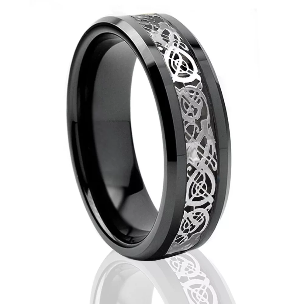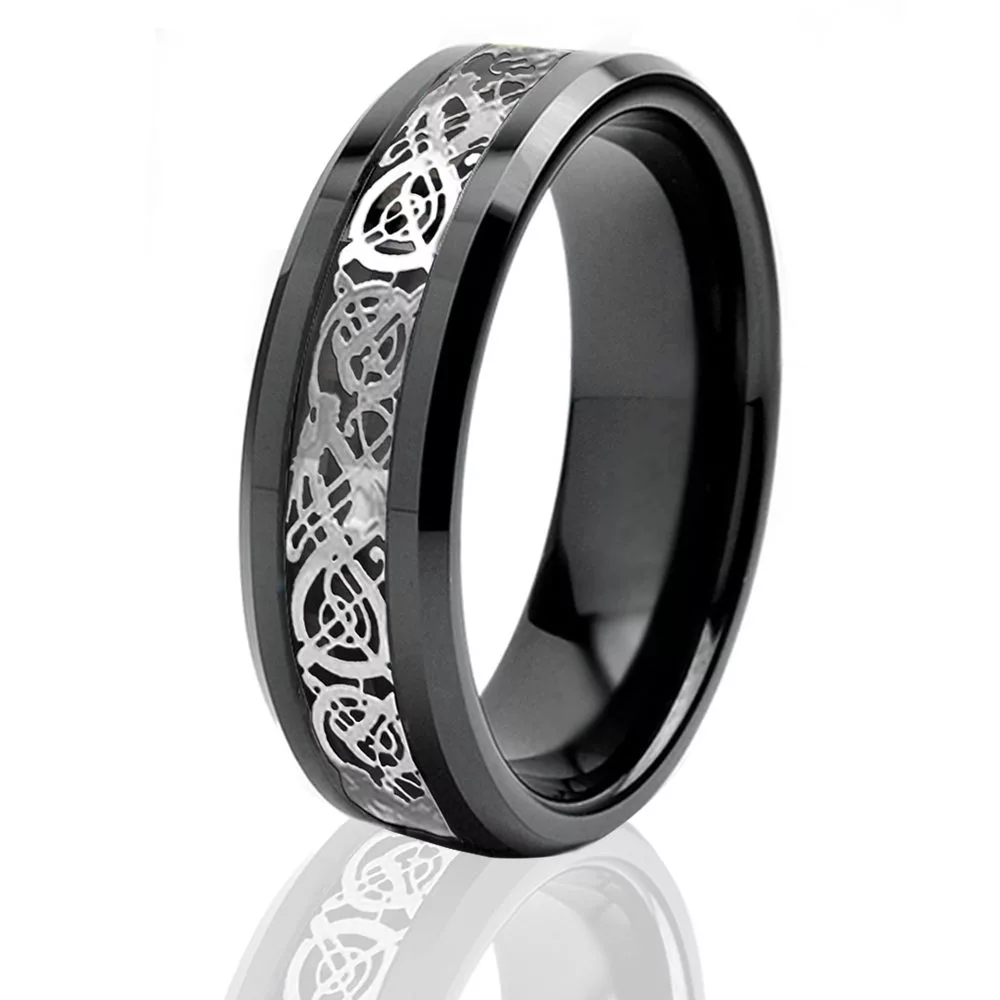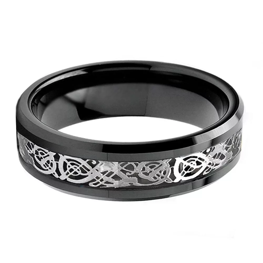 A gorgeous wedding band that is a symbol of power, protection, and strength. The design features a silver celtic dragon scroll inlay, with a carbon fiber background, set into a beautiful 6mm polished comfort fit tungsten band. The band features a premium polished black electroplated finish, and the inlays intricate pattern and stunning beauty makes this ring a true work of art.