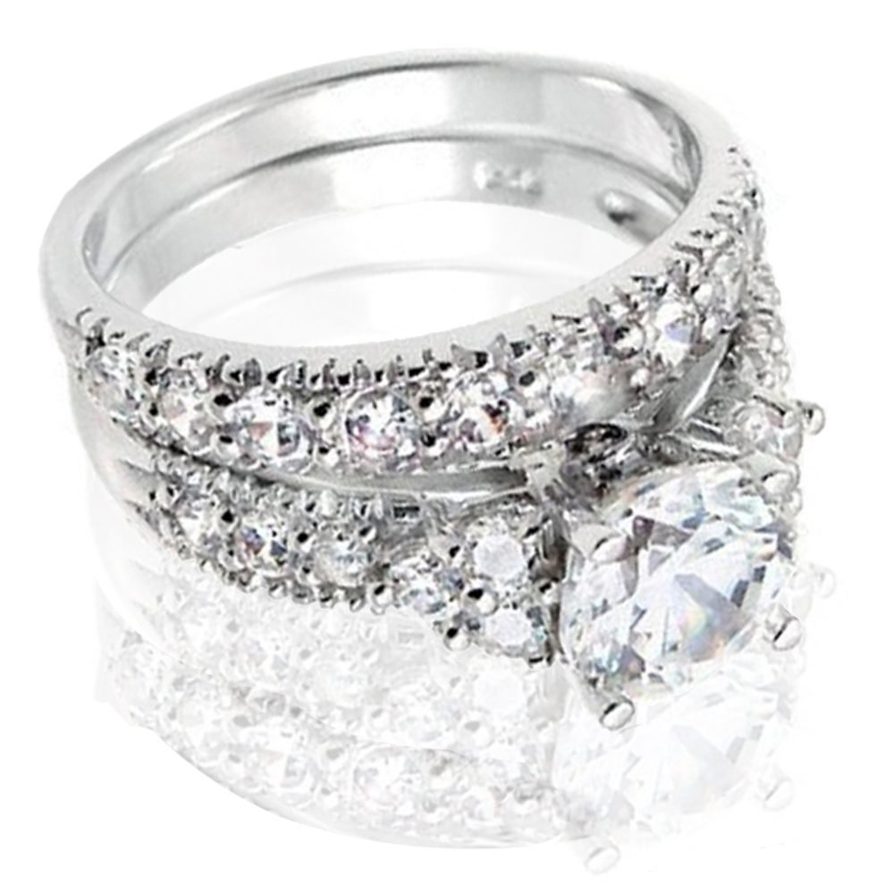 If you’re looking for a ring that’s more than just a piece of jewelry, but also a statement piece, look no further. A beautiful 2 piece set including a wedding band and a matching engagement ring. The engagement ring showcases a round cut center stone accented with 2 round cut accent stones on both sides. This two piece set is perfect for a woman looking for something that embraces elegance and luxury.