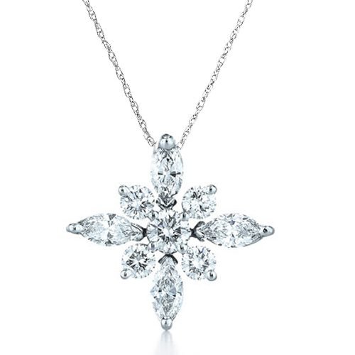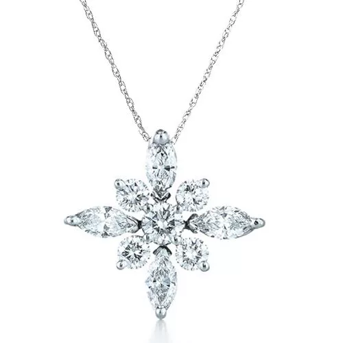 A beautiful necklace designed to bring extra sparkle and shine to your evening outfit. This stunning piece is crafted from 925 Sterling Silver and features a snowflake pendant with 4 marquise and 5 round diamond simulated cz stones. This pendant has an approximate total carat weight of 3.34ct diamond equivalent. Made from solid sterling silver and plated in tarnish resistant rhodium.