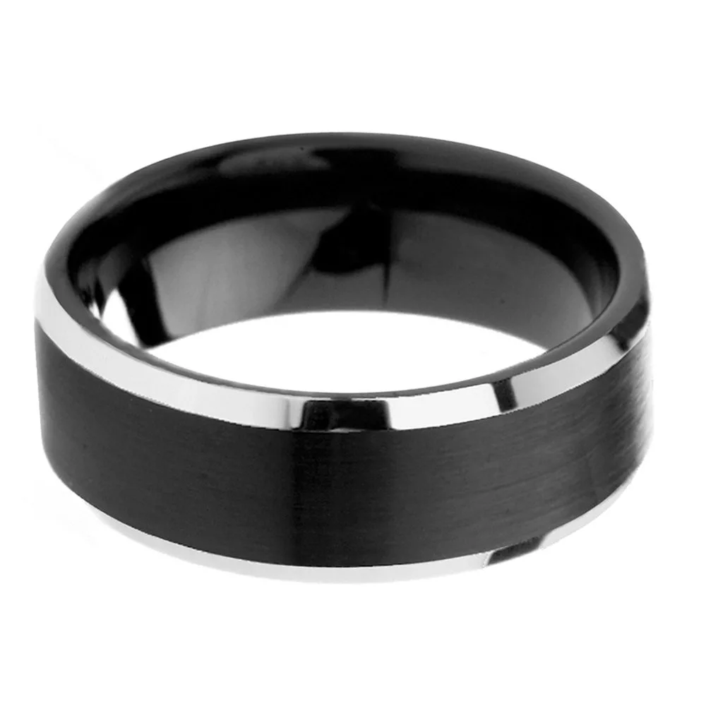 A truly modern take on a classic wedding band. A beautiful mens tungsten ring with electroplated black brushed center offset by silver polished edges. The polished beveled edges contrast the brushed center giving it an edgy, yet sophisticated look. Perfect for the groom or young adult looking for something traditional, yet, modern and fashion forward.