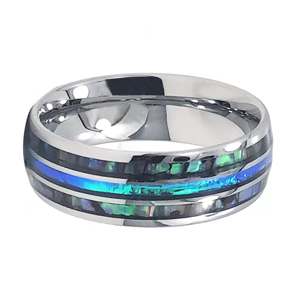 Traditional wedding bands are all the same. Plain, flat and boring. You were looking for something with a little more panache, an element of intrigue; something that could be worn during special occasions or casual nights out with friends. You’ve found it – the Meravi men’s 8mm tungsten wedding band with abalone inlay is the perfect upgrade to your style.