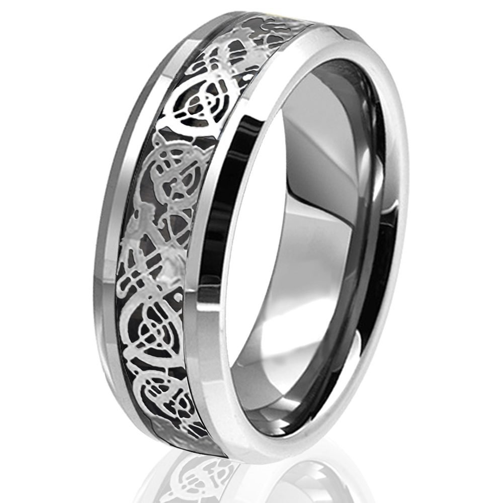 A gorgeous wedding band that is a symbol of power, protection, and strength. The design features a silver celtic dragon scroll inlay, with a carbon fiber background, set into a beautiful 8mm polished comfort fit tungsten band. The inlays intricate pattern and stunning beauty makes this ring a true work of art.